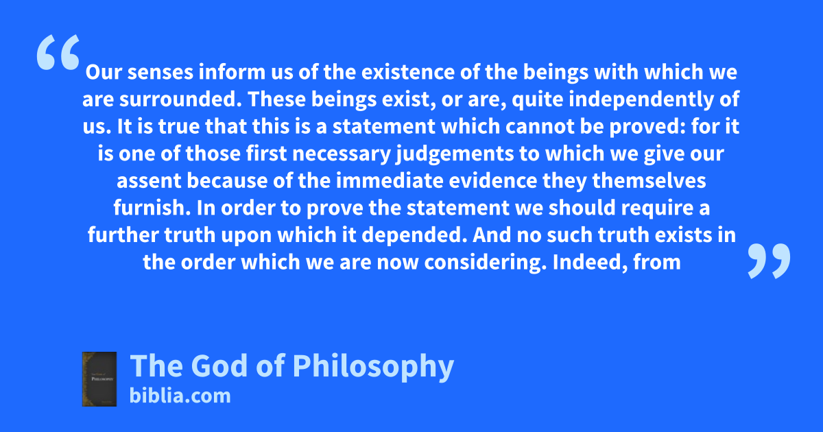 Our senses inform us of the existence of the beings with which we are surrounded. These beings exist, or are, quite independently of us. It is true that this is a statement which cannot be proved: for it is one of those first necessary judgements to which we give our assent because of the immediate evidence they themselves furnish. In order to prove the statement we should require a further truth upon which it depended. And no such truth exists in the order which we are now considering. Indeed, from