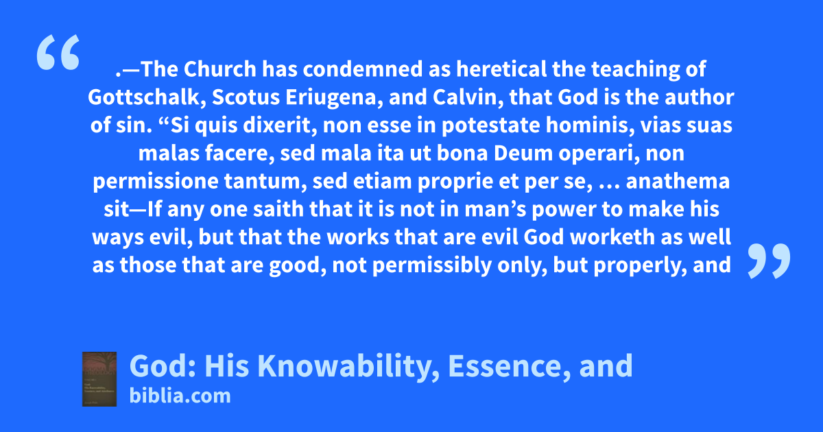 .—The Church has condemned as heretical the teaching of Gottschalk, Scotus Eriugena, and Calvin, that God is the author of sin. “Si quis dixerit, non esse in potestate hominis, vias suas malas facere, sed mala ita ut bona Deum operari, non permissione tantum, sed etiam proprie et per se, … anathema sit—If any one saith that it is not in man’s power to make his ways evil, but that the works that are evil God worketh as well as those that are good, not permissibly only, but properly, and