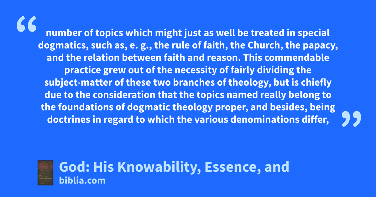 number of topics which might just as well be treated in special dogmatics, such as, e. g., the rule of faith, the Church, the papacy, and the relation between faith and reason. This commendable practice grew out of the necessity of fairly dividing the subject-matter of these two branches of theology, but is chiefly due to the consideration that the topics named really belong to the foundations of dogmatic theology proper, and besides, being doctrines in regard to which the various denominations differ,