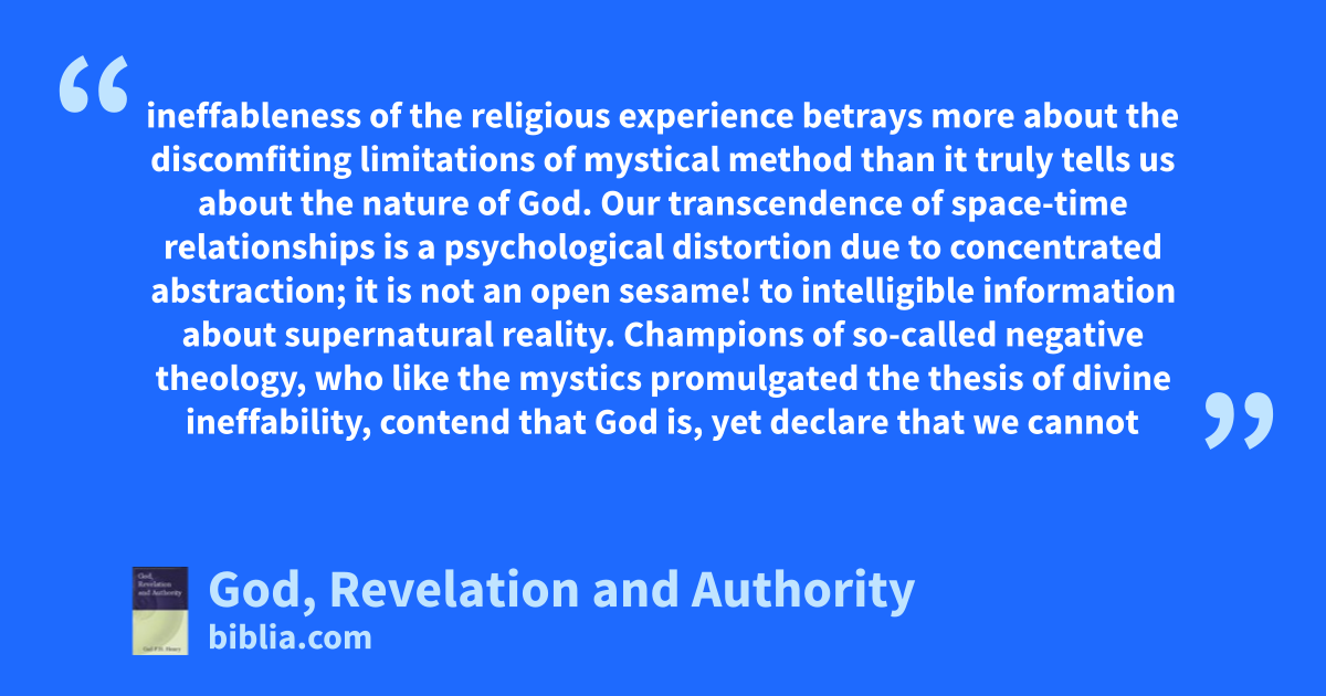ineffableness of the religious experience betrays more about the discomfiting limitations of mystical method than it truly tells us about the nature of God. Our transcendence of space-time relationships is a psychological distortion due to concentrated abstraction; it is not an open sesame! to intelligible information about supernatural reality. Champions of so-called negative theology, who like the mystics promulgated the thesis of divine ineffability, contend that God is, yet declare that we cannot