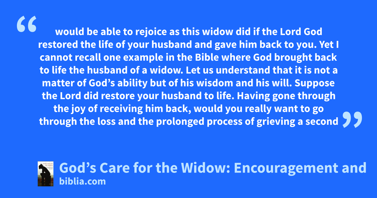 would be able to rejoice as this widow did if the Lord God restored the life of your husband and gave him back to you. Yet I cannot recall one example in the Bible where God brought back to life the husband of a widow. Let us understand that it is not a matter of God’s ability but of his wisdom and his will. Suppose the Lord did restore your husband to life. Having gone through the joy of receiving him back, would you really want to go through the loss and the prolonged process of grieving a second