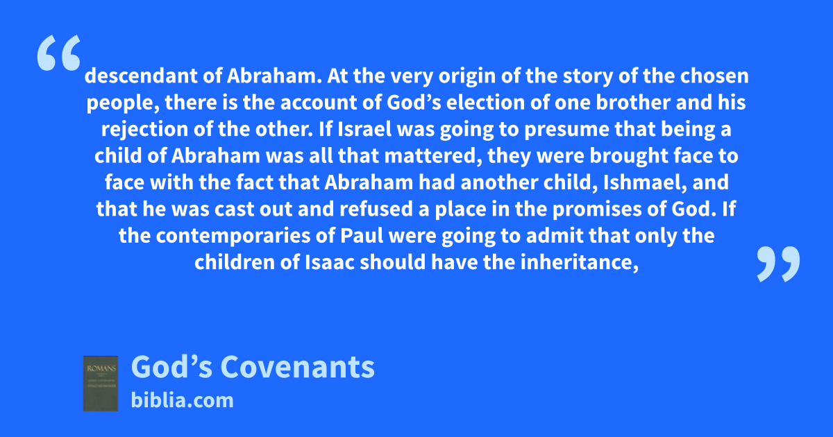descendant of Abraham. At the very origin of the story of the chosen people, there is the account of God’s election of one brother and his rejection of the other. If Israel was going to presume that being a child of Abraham was all that mattered, they were brought face to face with the fact that Abraham had another child, Ishmael, and that he was cast out and refused a place in the promises of God. If the contemporaries of Paul were going to admit that only the children of Isaac should have the inheritance,