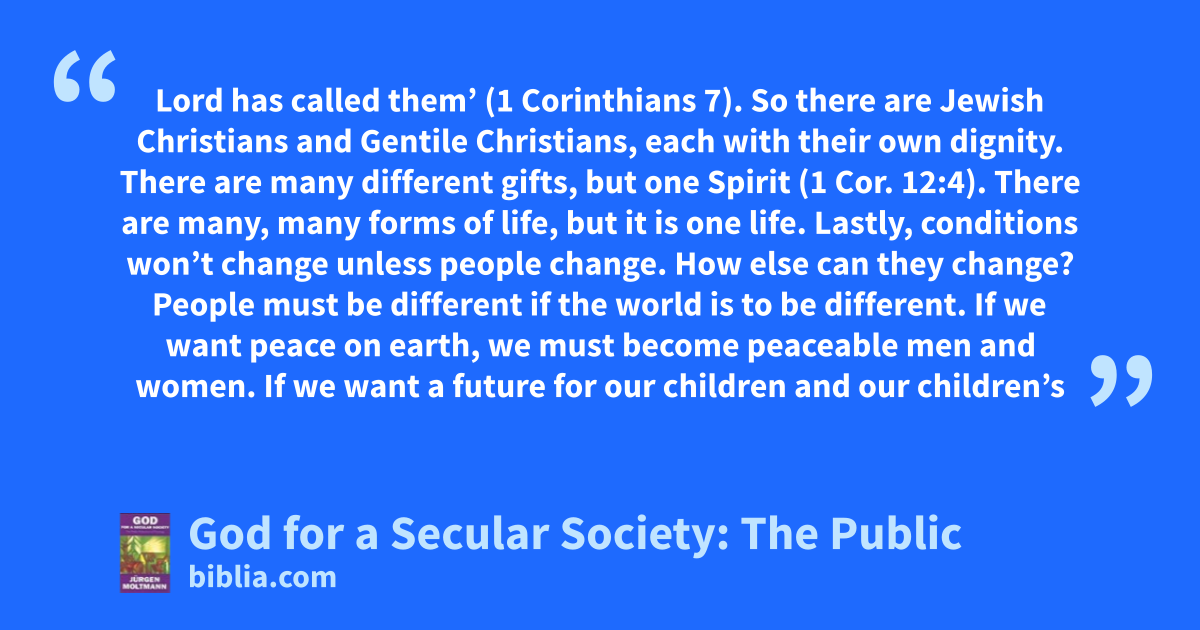 Lord has called them’ (1 Corinthians 7). So there are Jewish Christians and Gentile Christians, each with their own dignity. There are many different gifts, but one Spirit (1 Cor. 12:4). There are many, many forms of life, but it is one life. Lastly, conditions won’t change unless people change. How else can they change? People must be different if the world is to be different. If we want peace on earth, we must become peaceable men and women. If we want a future for our children and our children’s