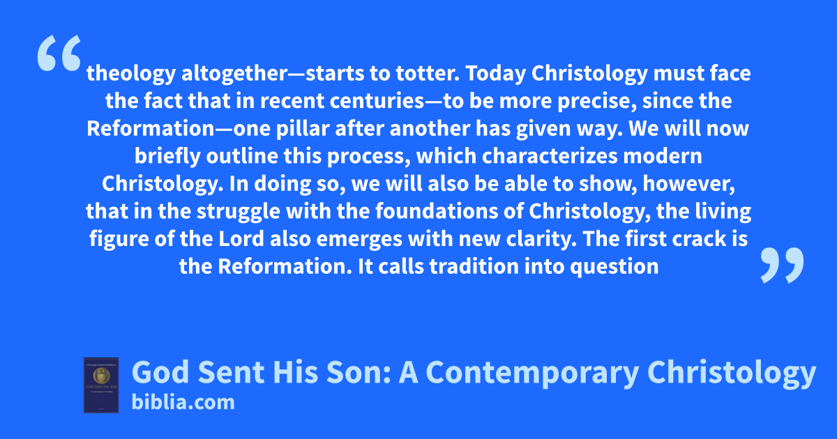theology altogether—starts to totter. Today Christology must face the fact that in recent centuries—to be more precise, since the Reformation—one pillar after another has given way. We will now briefly outline this process, which characterizes modern Christology. In doing so, we will also be able to show, however, that in the struggle with the foundations of Christology, the living figure of the Lord also emerges with new clarity. The first crack is the Reformation. It calls tradition into question