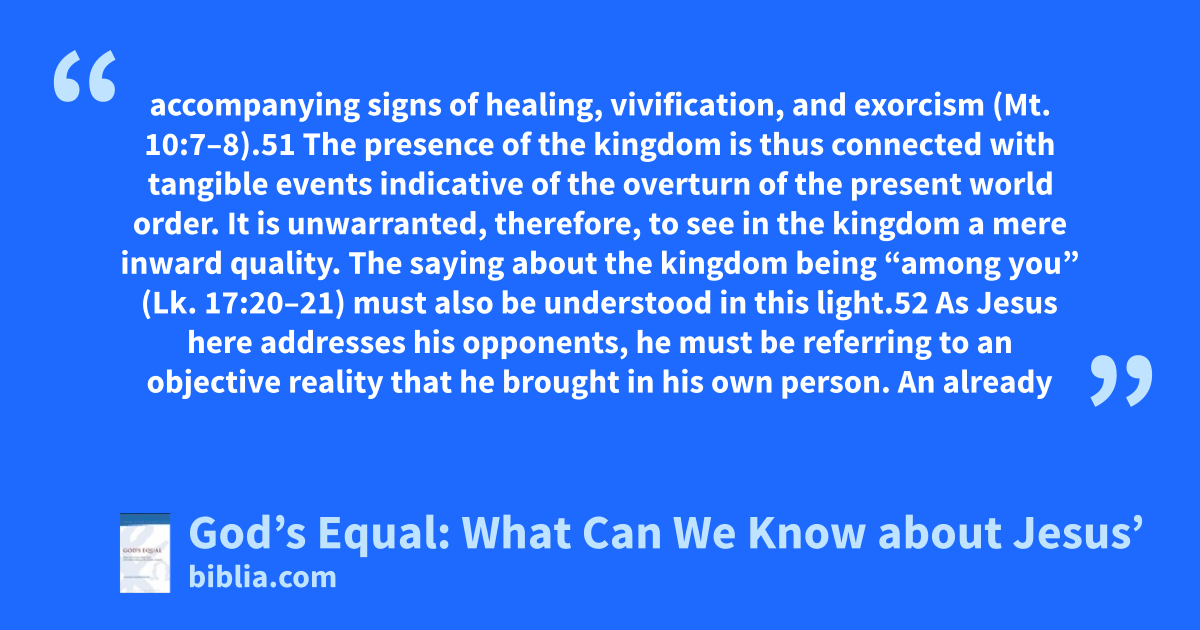 accompanying signs of healing, vivification, and exorcism (Mt. 10:7–8).51 The presence of the kingdom is thus connected with tangible events indicative of the overturn of the present world order. It is unwarranted, therefore, to see in the kingdom a mere inward quality. The saying about the kingdom being “among you” (Lk. 17:20–21) must also be understood in this light.52 As Jesus here addresses his opponents, he must be referring to an objective reality that he brought in his own person. An already