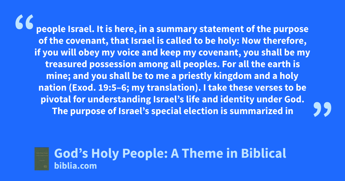people Israel. It is here, in a summary statement of the purpose of the covenant, that Israel is called to be holy: Now therefore, if you will obey my voice and keep my covenant, you shall be my treasured possession among all peoples. For all the earth is mine; and you shall be to me a priestly kingdom and a holy nation (Exod. 19:5–6; my translation). I take these verses to be pivotal for understanding Israel’s life and identity under God. The purpose of Israel’s special election is summarized in
