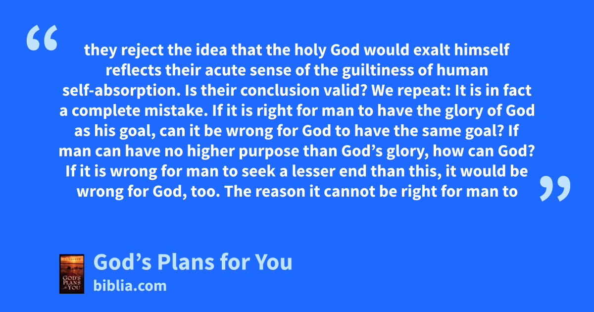 they reject the idea that the holy God would exalt himself reflects their acute sense of the guiltiness of human self-absorption. Is their conclusion valid? We repeat: It is in fact a complete mistake. If it is right for man to have the glory of God as his goal, can it be wrong for God to have the same goal? If man can have no higher purpose than God’s glory, how can God? If it is wrong for man to seek a lesser end than this, it would be wrong for God, too. The reason it cannot be right for man to
