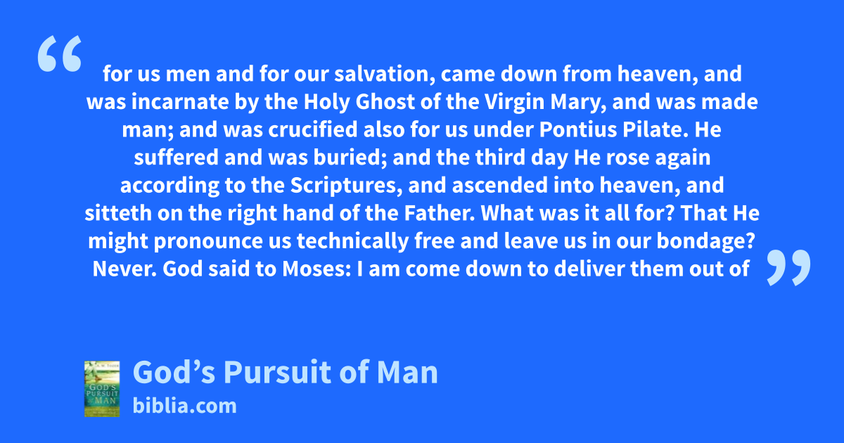 for us men and for our salvation, came down from heaven, and was incarnate by the Holy Ghost of the Virgin Mary, and was made man; and was crucified also for us under Pontius Pilate. He suffered and was buried; and the third day He rose again according to the Scriptures, and ascended into heaven, and sitteth on the right hand of the Father. What was it all for? That He might pronounce us technically free and leave us in our bondage? Never. God said to Moses: I am come down to deliver them out of