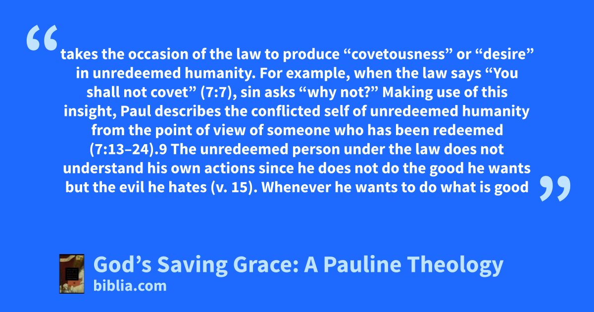 takes the occasion of the law to produce “covetousness” or “desire” in unredeemed humanity. For example, when the law says “You shall not covet” (7:7), sin asks “why not?” Making use of this insight, Paul describes the conflicted self of unredeemed humanity from the point of view of someone who has been redeemed (7:13–24).9 The unredeemed person under the law does not understand his own actions since he does not do the good he wants but the evil he hates (v. 15). Whenever he wants to do what is good
