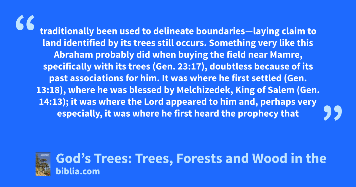 traditionally been used to delineate boundaries—laying claim to land identified by its trees still occurs. Something very like this Abraham probably did when buying the field near Mamre, specifically with its trees (Gen. 23:17), doubtless because of its past associations for him. It was where he first settled (Gen. 13:18), where he was blessed by Melchizedek, King of Salem (Gen. 14:13); it was where the Lord appeared to him and, perhaps very especially, it was where he first heard the prophecy that