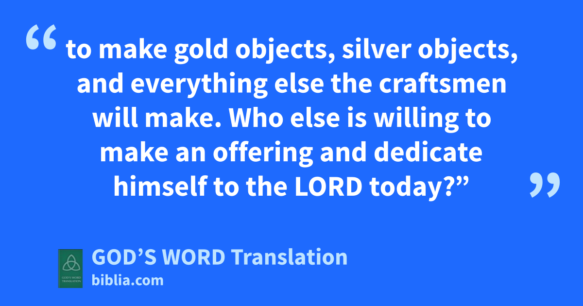 1 Then King David said to the whole assembly, “My son Solomon, the one whom God has chosen, is young and inexperienced. Yet, the work is important because this palace is not for a person but for the Lord God. 2 With all my might I gathered ⸤the materials⸥ for the temple of my God: gold for gold objects, silver for silver objects, bronze for bronze objects, iron for iron objects, wood for wooden objects, onyx stones and settings, black stones, stones of different colors, gems, and marble. 3 Moreover, I delight in the temple of my God. I have a personal treasury of gold and silver that I’m giving to my God’s temple in addition to everything else I gathered for the holy temple. 4 There are 225,000 pounds of gold from Ophir and 525,000 pounds of refined silver. They are to be used to cover the walls of the buildings, 5 to make gold objects, silver objects, and everything else the craftsmen will make. Who else is willing to make an offering and dedicate himself to the Lord today?”