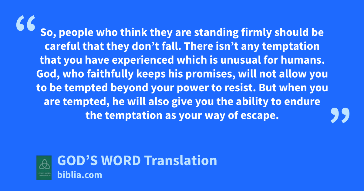 13 There isn’t any temptation that you have experienced which is unusual for humans. God, who faithfully keeps his promises, will not allow you to be tempted beyond your power to resist. But when you are tempted, he will also give you the ability to endure the temptation as your way of escape.