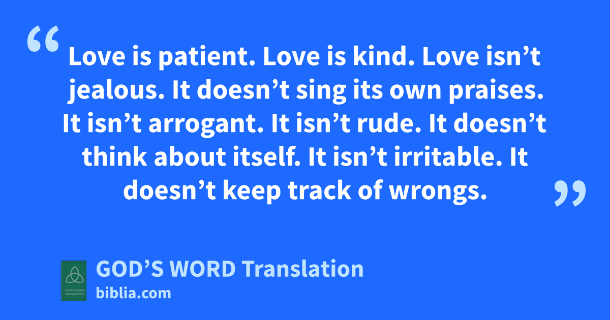 4 Love is patient. Love is kind. Love isn’t jealous. It doesn’t sing its own praises. It isn’t arrogant. 5 It isn’t rude. It doesn’t think about itself. It isn’t irritable. It doesn’t keep track of wrongs. 6 It isn’t happy when injustice is done, but it is happy with the truth. 7 Love never stops being patient, never stops believing, never stops hoping, never gives up.