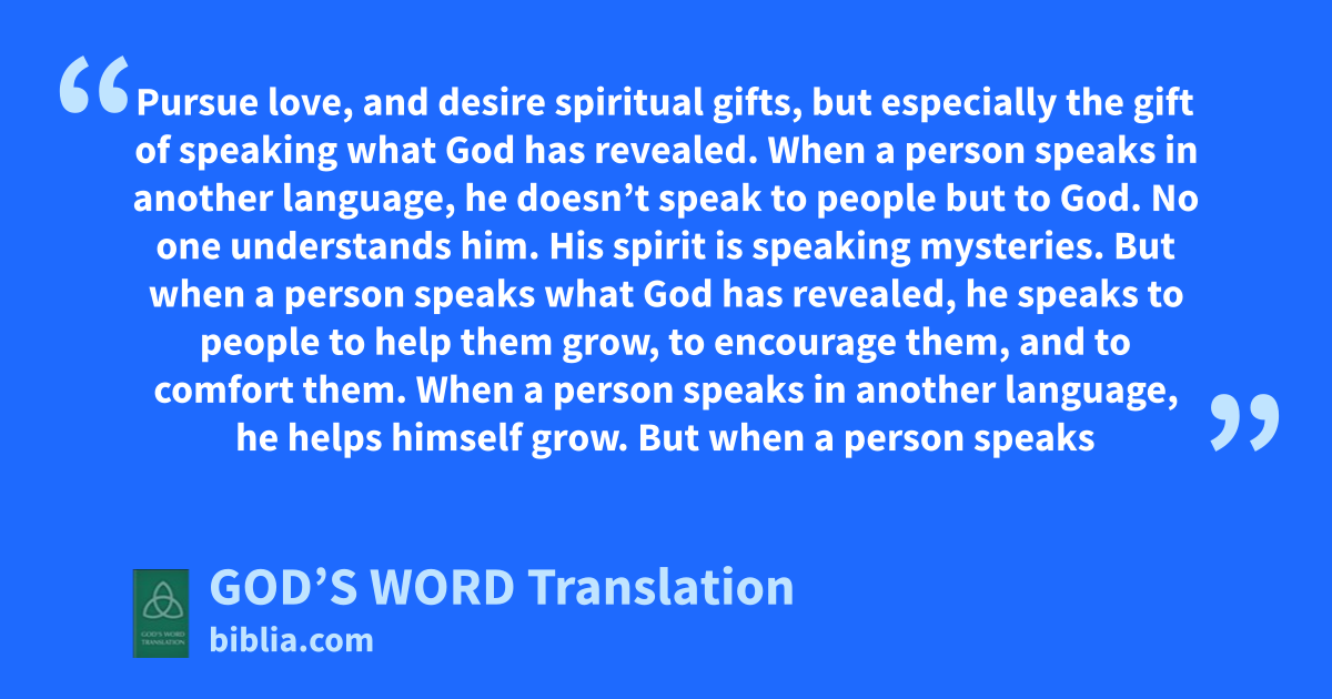 1 Pursue love, and desire spiritual gifts, but especially the gift of speaking what God has revealed. 2 When a person speaks in another language, he doesn’t speak to people but to God. No one understands him. His spirit is speaking mysteries. 3 But when a person speaks what God has revealed, he speaks to people to help them grow, to encourage them, and to comfort them. 4 When a person speaks in another language, he helps himself grow. But when a person speaks what God has revealed, he helps the church grow. 5 I wish that all of you could speak in other languages, but especially that you could speak what God has revealed. The person who speaks what God has revealed is more important than the person who speaks in other languages. This is true unless he can interpret what he says to help the church grow. 6 Brothers and sisters, it wouldn’t do you any good if I came to you speaking in other languages, unless I explained revelation, knowledge, prophecy, or doctrine to you.