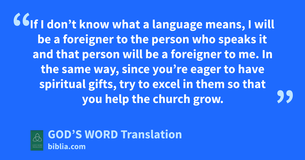 10 No matter how many different languages there are in the world, not one of them is without meaning. 11 If I don’t know what a language means, I will be a foreigner to the person who speaks it and that person will be a foreigner to me. 12 In the same way, since you’re eager to have spiritual gifts, try to excel in them so that you help the church grow. 13 So the person who speaks in another language should pray for an interpretation of what he says.
