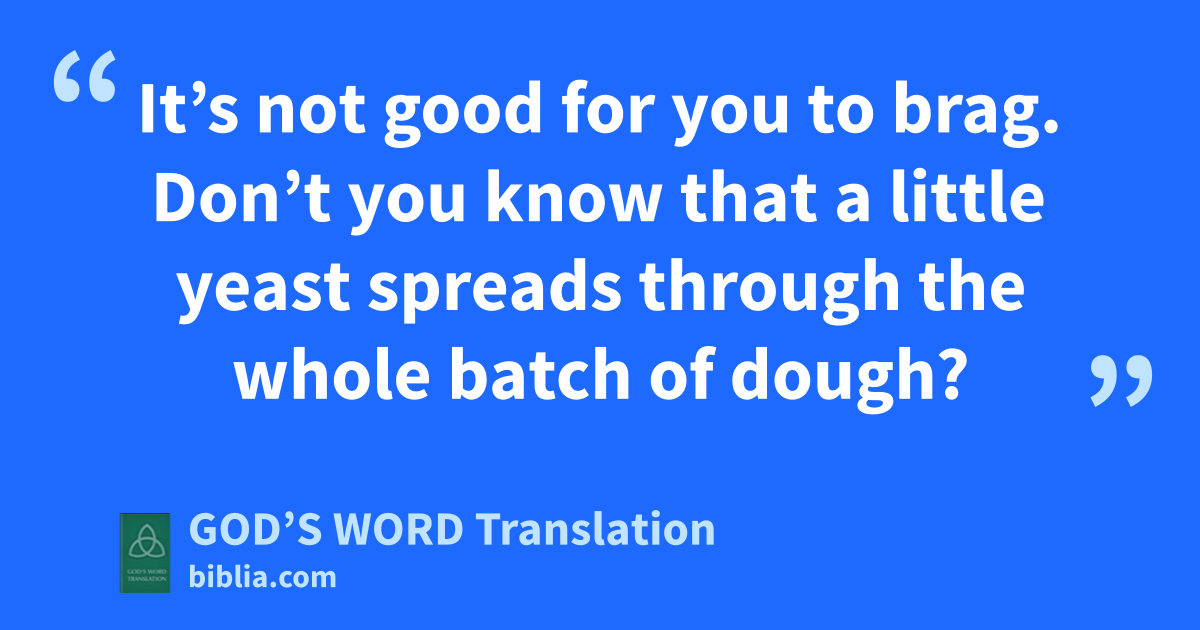 6 It’s not good for you to brag. Don’t you know that a little yeast spreads through the whole batch of dough? 7 Remove the old yeast ⸤of sin⸥ so that you may be a new batch of dough, since you don’t actually have the yeast ⸤of sin⸥.