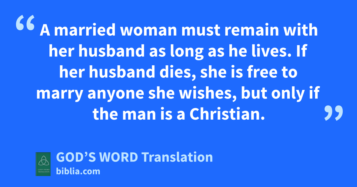 39 A married woman must remain with her husband as long as he lives. If her husband dies, she is free to marry anyone she wishes, but only if the man is a Christian.a 40 However, she will be more blessed if she stays as she is. That is my opinion, and I think that I, too, have God’s Spirit.