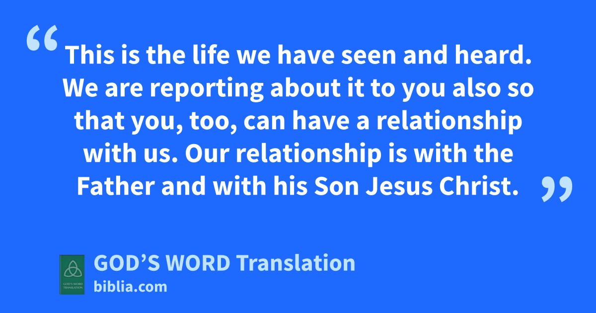 1 The Word of life existed from the beginning. We have heard it. We have seen it. We observed and touched it. 2 This life was revealed to us. We have seen it, and we testify about it. We are reporting to you about this eternal life that was in the presence of the Father and was revealed to us. 3 This is the life we have seen and heard. We are reporting about it to you also so that you, too, can have a relationship with us. Our relationship is with the Father and with his Son Jesus Christ. 4 We are writing this so that we can be completely filled with joy.