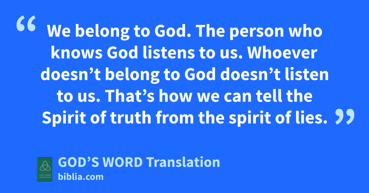 4 Dear children, you belong to God. So you have won the victory over these people, because the one who is in you is greater than the one who is in the world. 5 These people belong to the world. That’s why they speak the thoughts of the world, and the world listens to them. 6 We belong to God. The person who knows God listens to us. Whoever doesn’t belong to God doesn’t listen to us. That’s how we can tell the Spirit of truth from the spirit of lies.