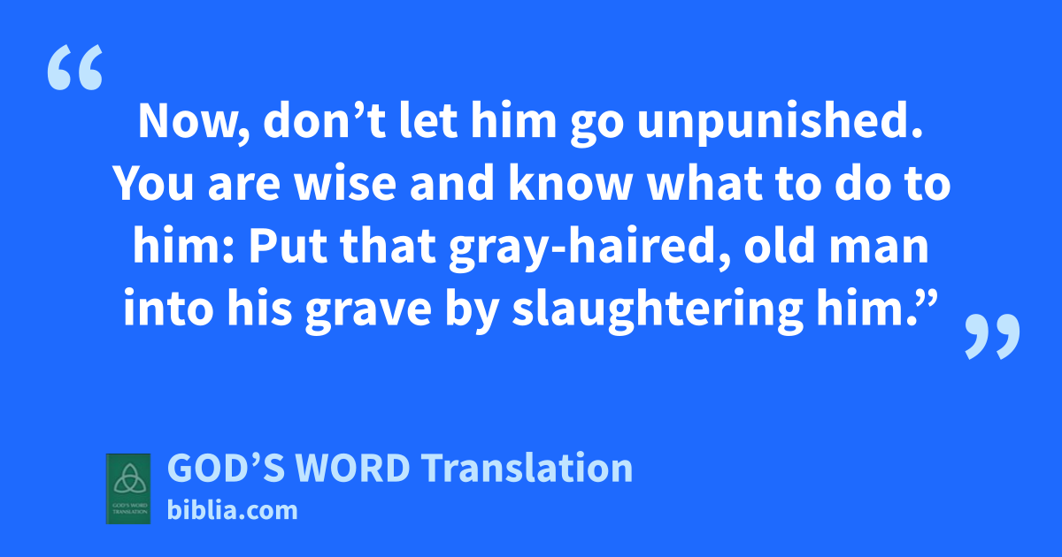 8 “Shimei, son of Gera from Bahurim in Benjamin, is still with you. He cursed me repeatedly when I went to Mahanaim. But when he came to meet me at the Jordan River, I took an oath by the Lord and said, ‘As long as I’m king, I won’t have you killed.’ 9 Now, don’t let him go unpunished. You are wise and know what to do to him: Put that gray-haired, old man into his grave by slaughtering him.”