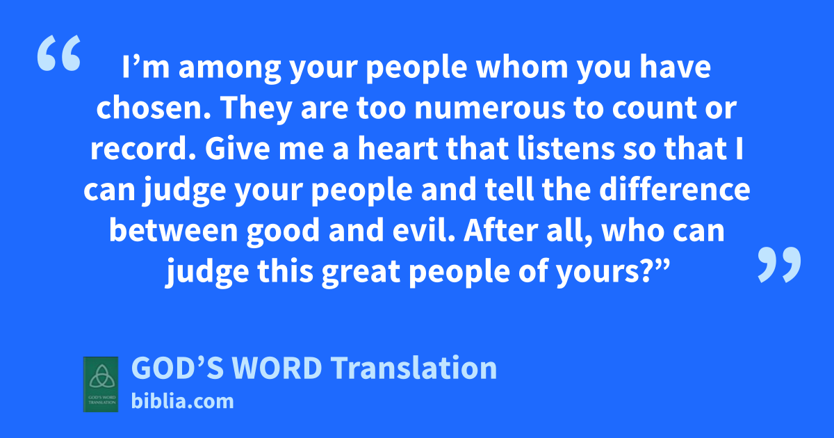 7 “Lord my God, although I’m young and inexperienced, you’ve made me king in place of my father David. 8 I’m among your people whom you have chosen. They are too numerous to count or record. 9 Give me a heart that listens so that I can judge your people and tell the difference between good and evil. After all, who can judge this great people of yours?”