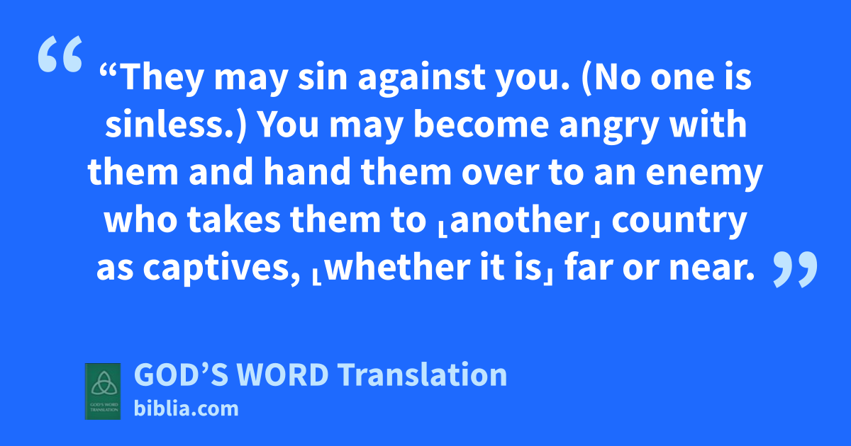 54 When Solomon finished praying this prayer for mercy to the Lord, he stood in front of the Lord’s altar, where he had been kneeling with his hands stretched out toward heaven. 55 Then he stood and in a loud voice blessed the entire assembly of Israel, 56 “Thanks be to the Lord! He has given his people Israel rest, as he had promised. None of the good promises he made through his servant Moses has failed to come true. 57 May the Lord our God be with us as he was with our ancestors. May he never leave us or abandon us. 58 May he bend our hearts toward him. Then we will follow him and keep his commands, laws, and rules, which he commanded our ancestors ⸤to keep⸥. 59 May these words which I have prayed to the Lord be near the Lord our God day and night. Then he will give me and his people Israel justice every day as it is needed. 60 In this way all the people of the world will know that the Lord is God and there is no other ⸤god⸥. 61 May your hearts be committed to the Lord our God. Then you will live by his laws and keep his commands as you have today.”