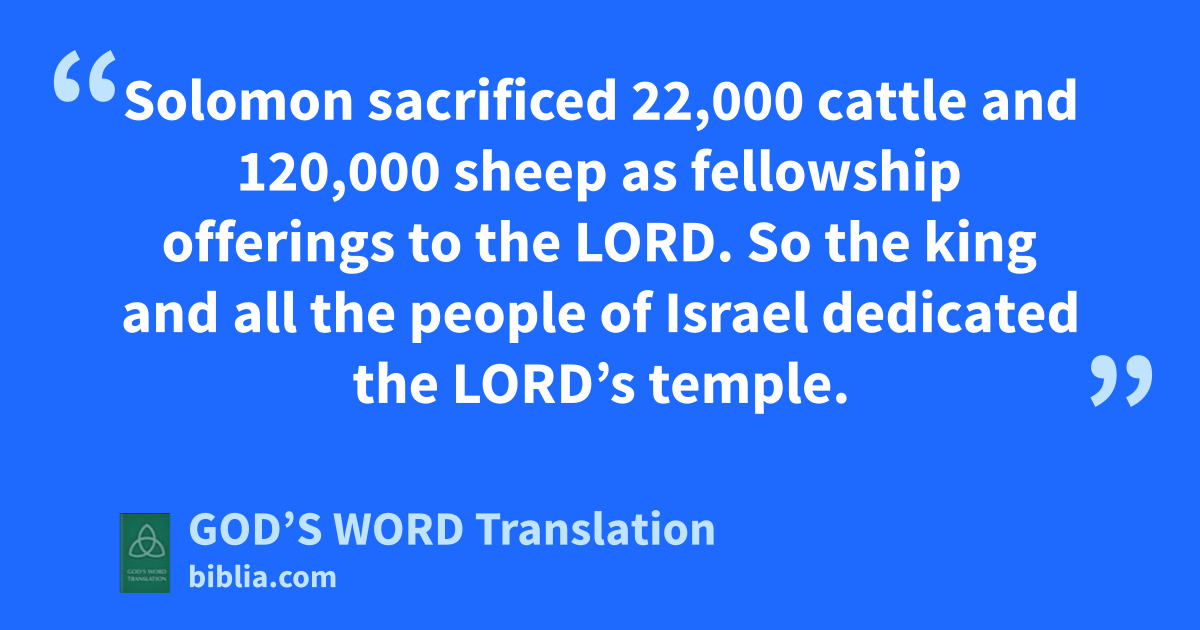 62 Then the king and all Israel offered sacrifices to the Lord. 63 Solomon sacrificed 22,000 cattle and 120,000 sheep as fellowship offerings to the Lord. So the king and all the people of Israel dedicated the Lord’s temple.