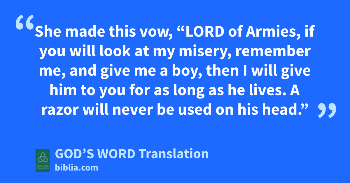 9 One day, after Hannah had something to eat and drink in Shiloh, she got up. (The priest Eli was sitting on a chair by the door of the Lord’s temple.) 10 Though she was resentful, she prayed to the Lord while she cried. 11 She made this vow, “Lord of Armies, if you will look at my misery, remember me, and give me a boy, then I will give him to you for as long as he lives. A razor will never be used on his head.” 12 While Hannah was praying a long time in front of the Lord, Eli was watching her mouth. 13 She was praying silently. Her voice couldn’t be heard; only her lips were moving. Eli thought she was drunk.
