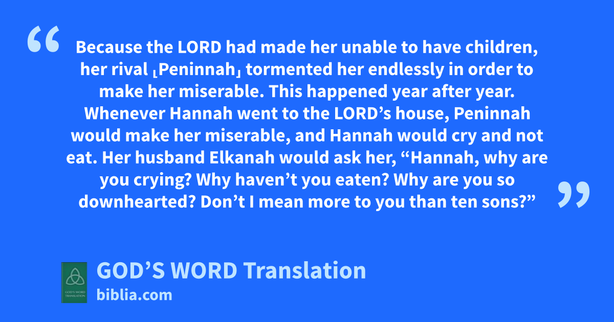 4 Whenever Elkanah offered a sacrifice, he would give portions of it to his wife Peninnah and all her sons and daughters. 5 He would also give one portion to Hannah because he loved her, even though the Lord had kept her from having children. 6 Because the Lord had made her unable to have children, her rival ⸤Peninnah⸥ tormented her endlessly in order to make her miserable. 7 This happened year after year. Whenever Hannah went to the Lord’s house, Peninnah would make her miserable, and Hannah would cry and not eat. 8 Her husband Elkanah would ask her, “Hannah, why are you crying? Why haven’t you eaten? Why are you so downhearted? Don’t I mean more to you than ten sons?”