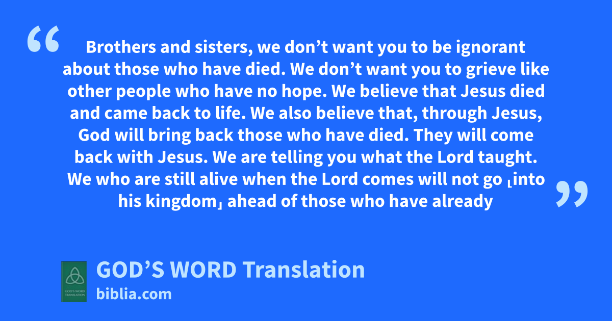 13 Brothers and sisters, we don’t want you to be ignorant about those who have died. We don’t want you to grieve like other people who have no hope. 14 We believe that Jesus died and came back to life. We also believe that, through Jesus, God will bring back those who have died. They will come back with Jesus. 15 We are telling you what the Lord taught. We who are still alive when the Lord comes will not go ⸤into his kingdom⸥ ahead of those who have already died. 16 The Lord will come from heaven with a command, with the voice of the archangel, and with the trumpet ⸤call⸥ of God. First, the dead who believed in Christ will come back to life. 17 Then, together with them, we who are still alive will be taken in the clouds to meet the Lord in the air. In this way we will always be with the Lord. 18 So then, comfort each other with these words!