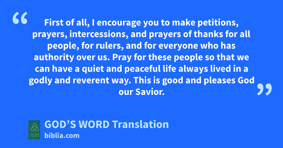 1 First of all, I encourage you to make petitions, prayers, intercessions, and prayers of thanks for all people, 2 for rulers, and for everyone who has authority over us. Pray for these people so that we can have a quiet and peaceful life always lived in a godly and reverent way. 3 This is good and pleases God our Savior. 4 He wants all people to be saved and to learn the truth. 5 There is one God. There is also one mediator between God and humans—a human, Christ Jesus. 6 He sacrificed himself for all people to free them from their sins. This message is valid for every era. 7 I was appointed to spread this Good News and to be an apostle to teach people who are not Jewish about faith and truth. I’m telling you the truth. I’m not lying.