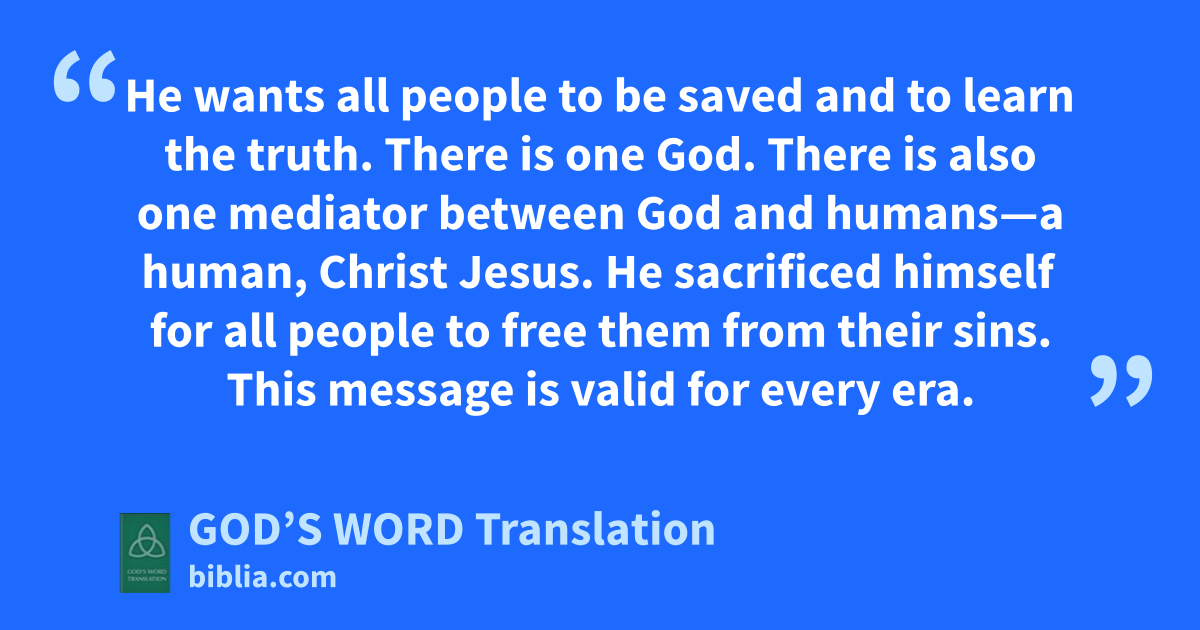 1 First of all, I encourage you to make petitions, prayers, intercessions, and prayers of thanks for all people, 2 for rulers, and for everyone who has authority over us. Pray for these people so that we can have a quiet and peaceful life always lived in a godly and reverent way. 3 This is good and pleases God our Savior. 4 He wants all people to be saved and to learn the truth. 5 There is one God. There is also one mediator between God and humans—a human, Christ Jesus. 6 He sacrificed himself for all people to free them from their sins. This message is valid for every era. 7 I was appointed to spread this Good News and to be an apostle to teach people who are not Jewish about faith and truth. I’m telling you the truth. I’m not lying.