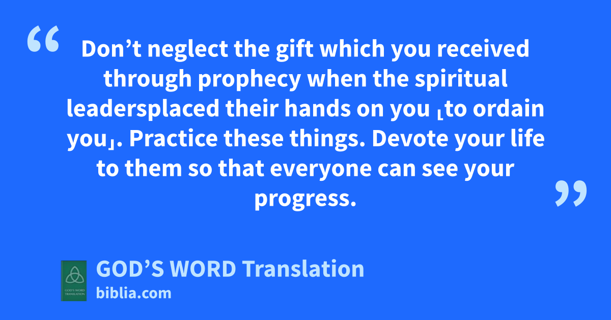 11 Insist on these things and teach them. 12 Don’t let anyone look down on you for being young. Instead, make your speech, behavior, love, faith, and purity an example for other believers. 13 Until I get there, concentrate on reading ⸤Scripture⸥ in worship, giving encouraging messages, and teaching people. 14 Don’t neglect the gift which you received through prophecy when the spiritual leadersa placed their hands on you ⸤to ordain you⸥. 15 Practice these things. Devote your life to them so that everyone can see your progress. 16 Focus on your life and your teaching. Continue to do what I’ve told you. If you do this, you will save yourself and those who hear you.