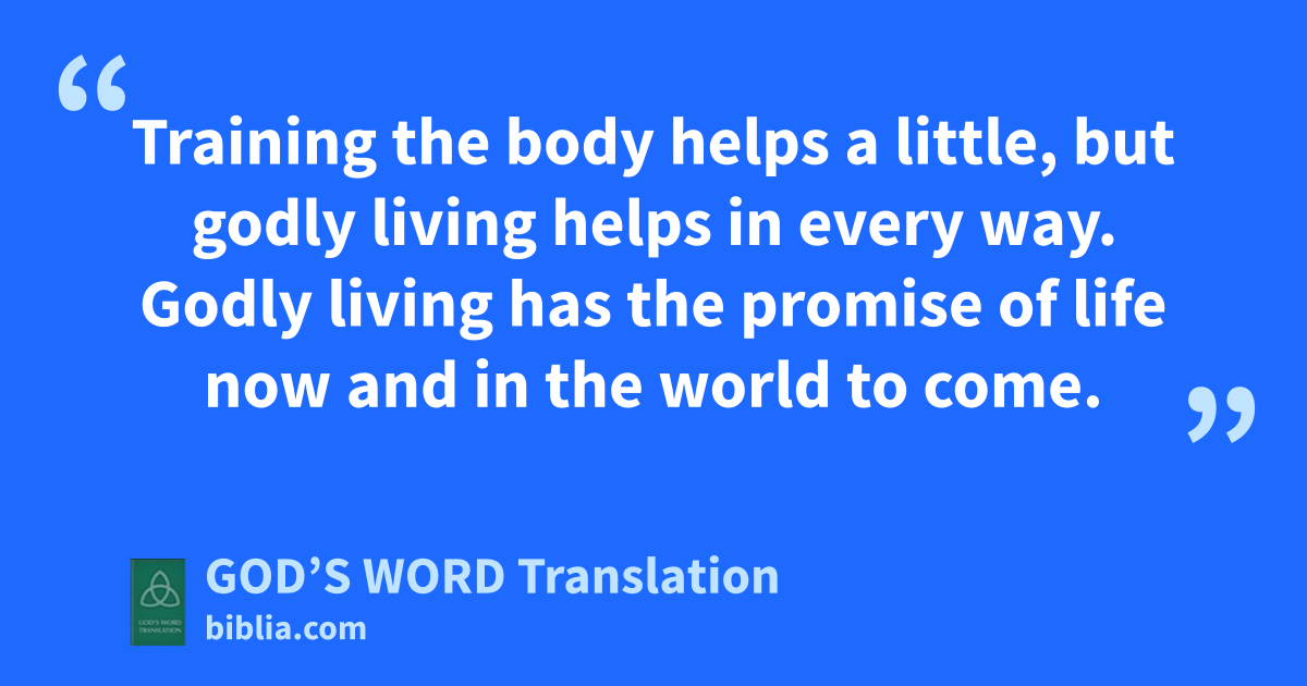 6 You are a good servant of Christ Jesus when you point these things out to our brothers and sisters. Then you will be nourished by the words of the Christian faith and the excellent teachings which you have followed closely. 7 Don’t have anything to do with godless myths that old women like to tell. Rather, train yourself to live a godly life. 8 Training the body helps a little, but godly living helps in every way. Godly living has the promise of life now and in the world to come. 9 This is a statement that can be trusted and deserves complete acceptance. 10 Certainly, we work hard and struggle to live a godly life, because we place our confidence in the living God. He is the Savior of all people, especially of those who believe.
