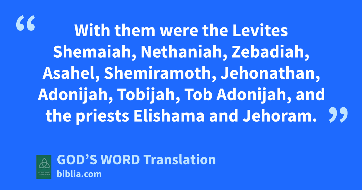 7 In the third year of his reign, he sent his officers Ben Hail, Obadiah, Zechariah, Nethanel, and Micaiah to teach in the cities of Judah. 8 With them were the Levites Shemaiah, Nethaniah, Zebadiah, Asahel, Shemiramoth, Jehonathan, Adonijah, Tobijah, Tob Adonijah, and the priests Elishama and Jehoram. 9 They taught in Judah. They had the Book of the Lord’s Teachings with them when they taught the people in all the cities of Judah.