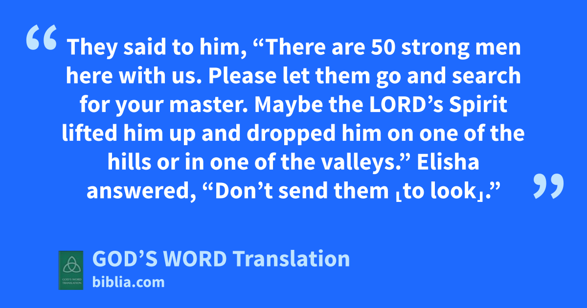 Elisha answered, “Don’t send them ⸤to look⸥.” 17 But the disciples kept urging him ⸤to send the men⸥ until he was embarrassed. So he said, “Send them.” They sent 50 men who searched for three days without finding him. 18 They returned to Elisha in Jericho, where he was waiting. He said, “Didn’t I tell you not to go?”