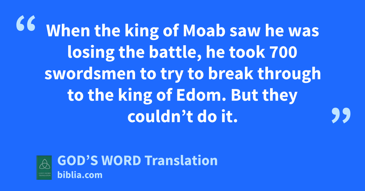 24 So when the Moabites came to Israel’s camp, the Israelites attacked them, and they fled from the Israelites. Israel went after the Moabites and defeated them. 25 Then Israel tore down the cities, each man throwing rocks on every good field until it was covered. They sealed every well and cut down every good tree. Only the stones ⸤in the walls⸥ of Kir Hareseth were left. Soldiers surrounded Kir Hareseth and attacked it with slings and stones. 26 When the king of Moab saw he was losing the battle, he took 700 swordsmen to try to break through to the king of Edom. But they couldn’t do it. 27 Then he took his firstborn son, who would have succeeded him as king, and sacrificed him on the wall as a burnt offering. There was bitter anger against the Israelites. So they went home to their own country.
