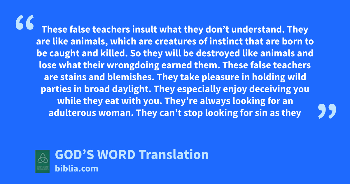 These false teachers are stains and blemishes. They take pleasure in holding wild parties in broad daylight. They especially enjoy deceiving you while they eat with you. 14 They’re always looking for an adulterous woman. They can’t stop looking for sin as they seduce people who aren’t sure of what they believe. Their minds are focused on their greed. They are cursed.