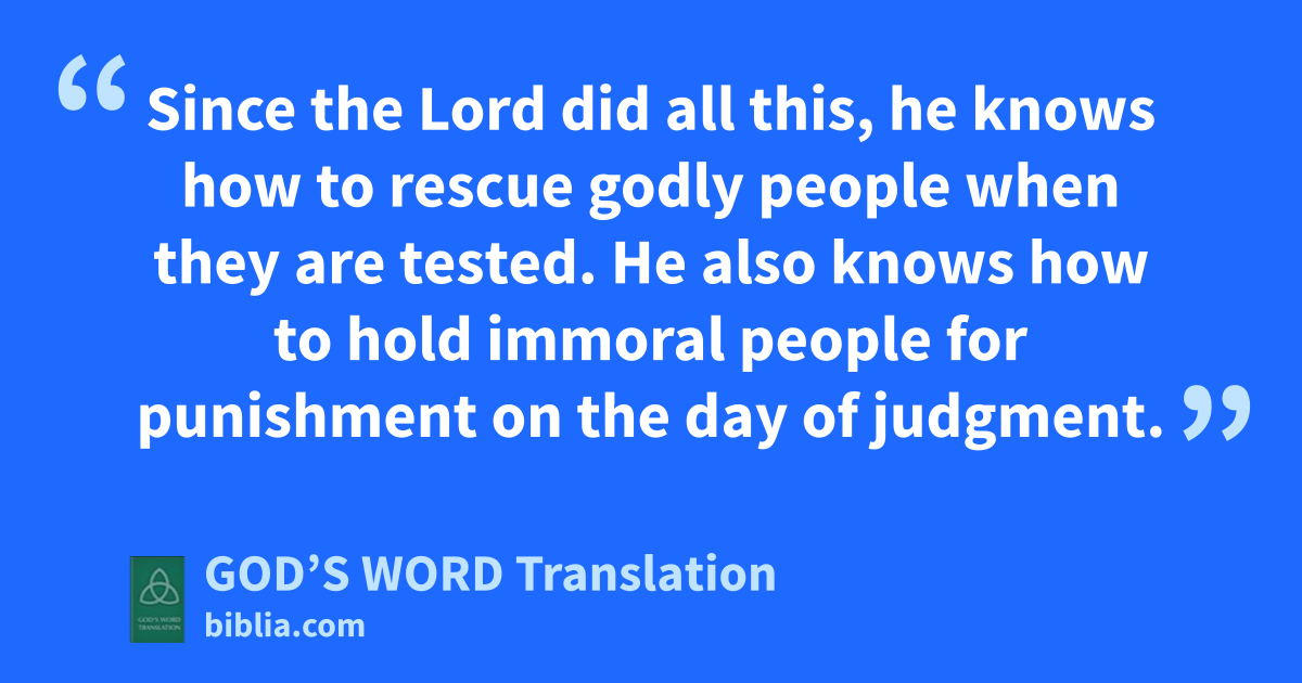 9 Since the Lord did all this, he knows how to rescue godly people when they are tested. He also knows how to hold immoral people for punishment on the day of judgment. 10 This is especially true of those who follow their corrupt nature along the path of impure desires and who despise the Lord’s authority.