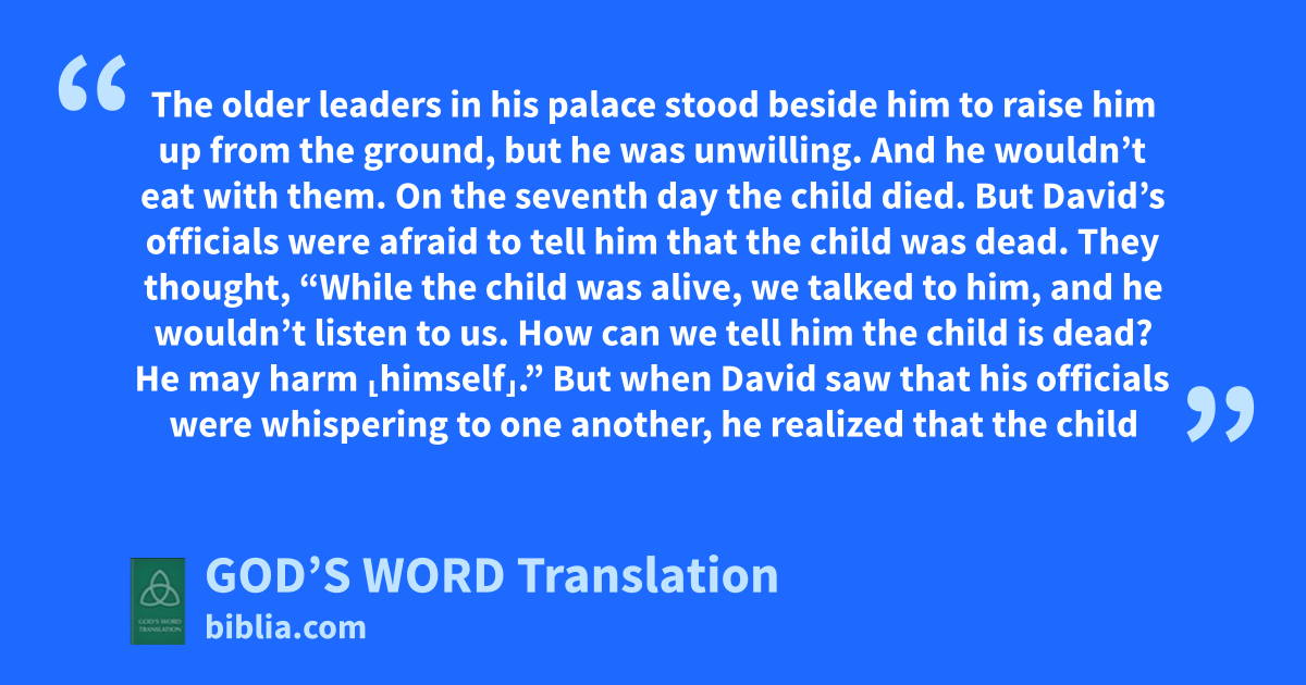 18 On the seventh day the child died. But David’s officials were afraid to tell him that the child was dead. They thought, “While the child was alive, we talked to him, and he wouldn’t listen to us. How can we tell him the child is dead? He may harm ⸤himself⸥.”