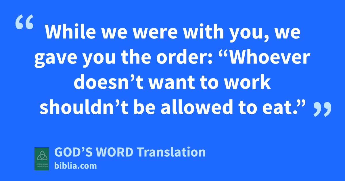 6 Brothers and sisters, in the name of our Lord Jesus Christ we order you not to associate with any believer who doesn’t live a disciplined life and doesn’t follow the tradition you received from us. 7 You know what you must do to imitate us. We lived a disciplined life among you. 8 We didn’t eat anyone’s food without paying for it. Instead, we worked hard and struggled night and day in order not to be a burden to any of you. 9 It’s not as though we didn’t have a right to receive support. Rather, we wanted to set an example for you to follow. 10 While we were with you, we gave you the order: “Whoever doesn’t want to work shouldn’t be allowed to eat.”