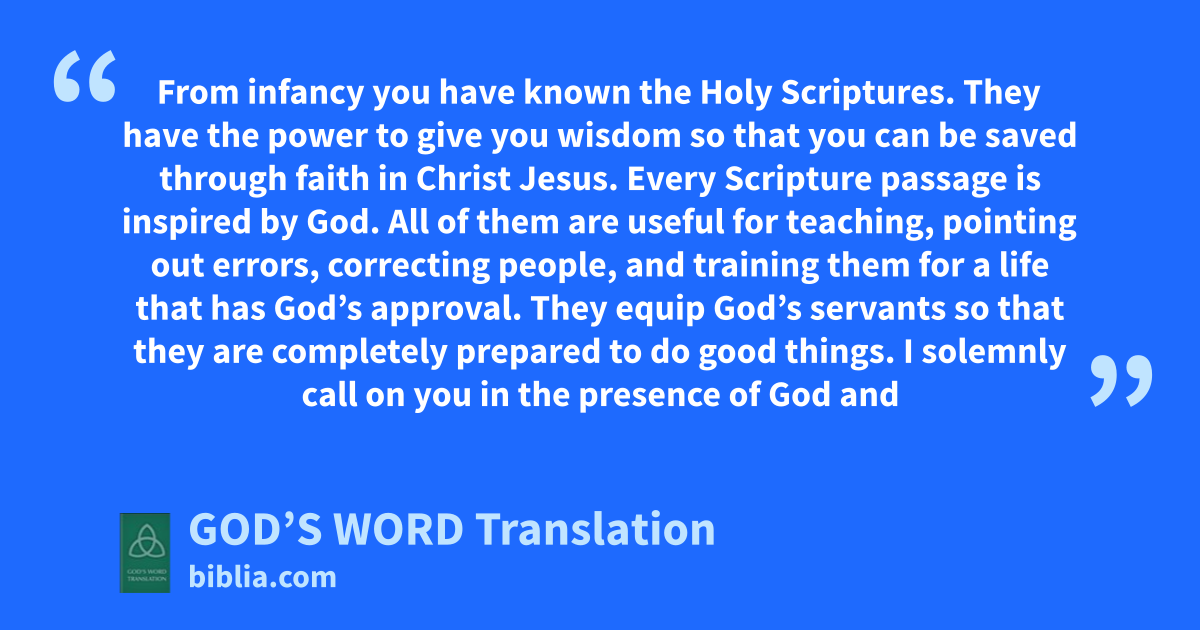 14 However, continue in what you have learned and found to be true. You know who your teachers were. 15 From infancy you have known the Holy Scriptures. They have the power to give you wisdom so that you can be saved through faith in Christ Jesus. 16 Every Scripture passage is inspired by God. All of them are useful for teaching, pointing out errors, correcting people, and training them for a life that has God’s approval. 17 They equip God’s servants so that they are completely prepared to do good things.