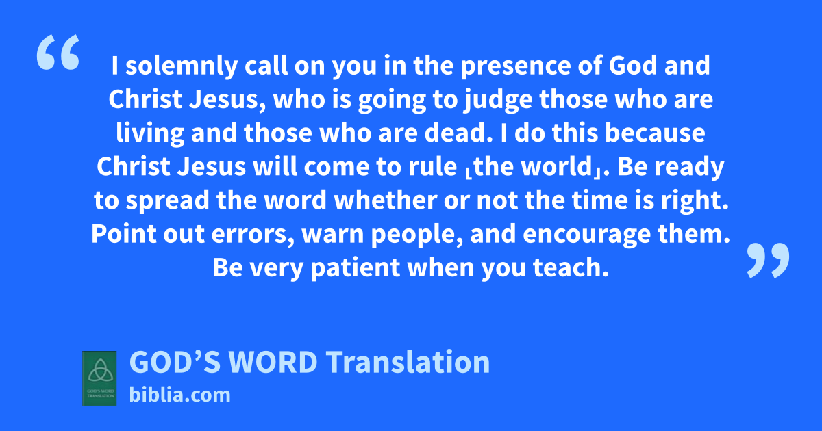 1 I solemnly call on you in the presence of God and Christ Jesus, who is going to judge those who are living and those who are dead. I do this because Christ Jesus will come to rule ⸤the world⸥. 2 Be ready to spread the word whether or not the time is right. Point out errors, warn people, and encourage them. Be very patient when you teach.