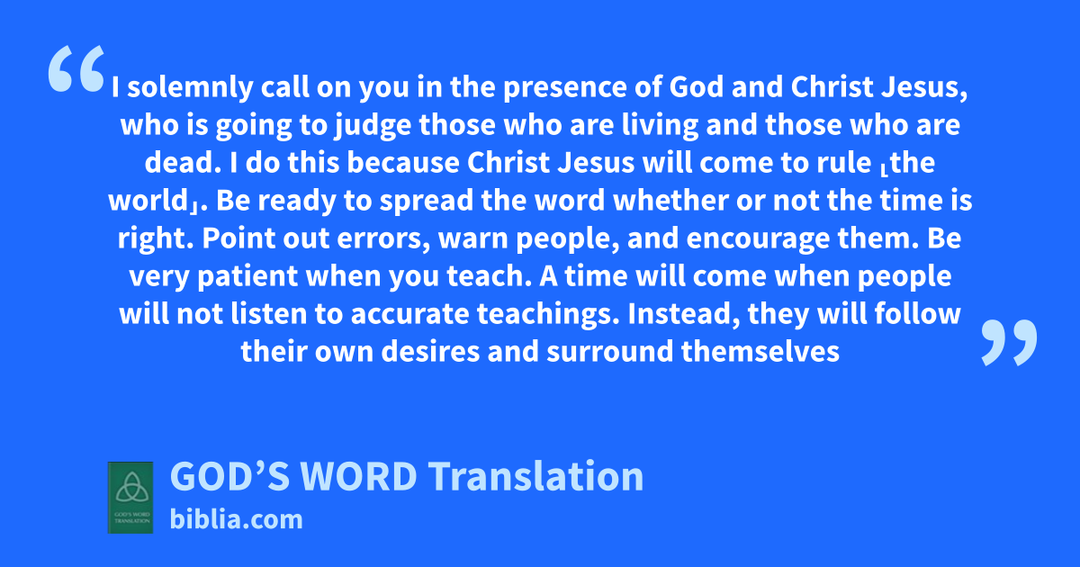 1 I solemnly call on you in the presence of God and Christ Jesus, who is going to judge those who are living and those who are dead. I do this because Christ Jesus will come to rule ⸤the world⸥. 2 Be ready to spread the word whether or not the time is right. Point out errors, warn people, and encourage them. Be very patient when you teach.