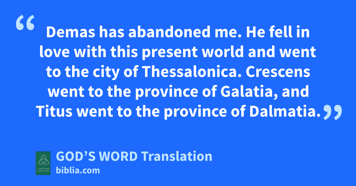 9 Hurry to visit me soon. 10 Demas has abandoned me. He fell in love with this present world and went to the city of Thessalonica. Crescens went to the province of Galatia, and Titus went to the province of Dalmatia. 11 Only Luke is with me. Get Mark and bring him with you. He is useful to me in my work. 12 I’m sending Tychicus to the city of Ephesus as my representative.