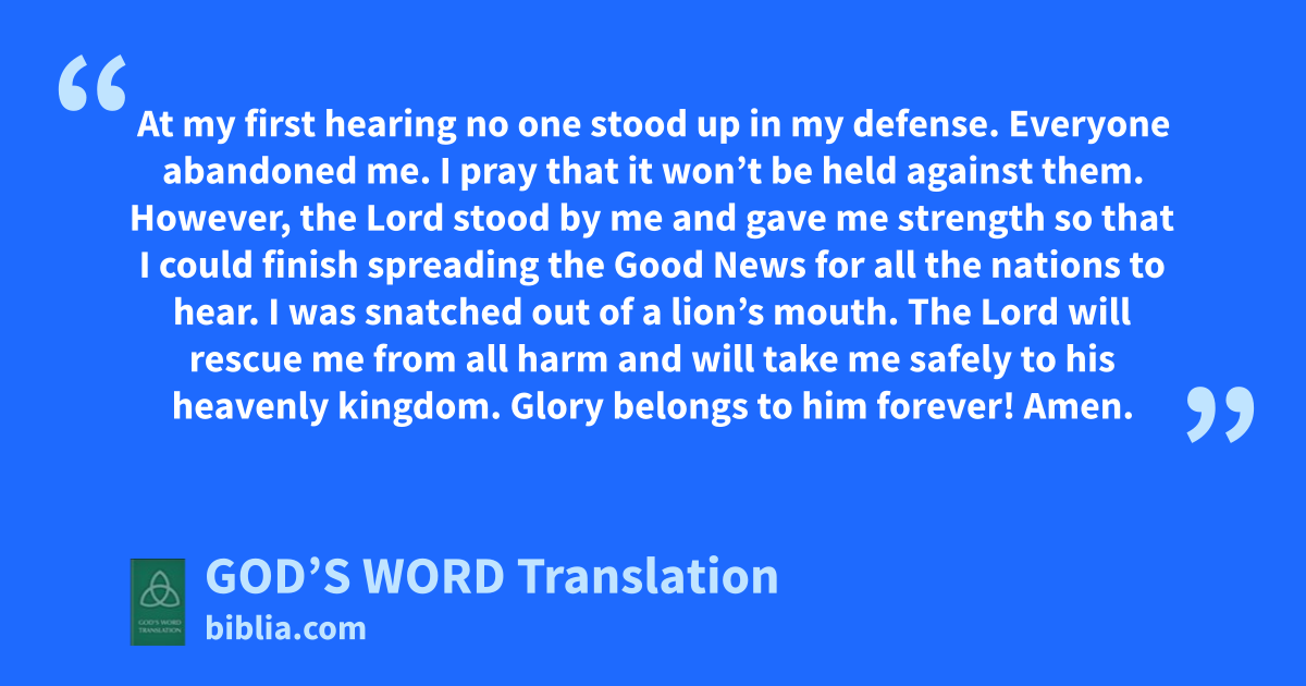 14 Alexander the metalworker did me a great deal of harm. The Lord will pay him back for what he did. 15 Watch out for him. He violently opposed what we said. 16 At my first hearing no one stood up in my defense. Everyone abandoned me. I pray that it won’t be held against them. 17 However, the Lord stood by me and gave me strength so that I could finish spreading the Good News for all the nations to hear. I was snatched out of a lion’s mouth. 18 The Lord will rescue me from all harm and will take me safely to his heavenly kingdom. Glory belongs to him forever! Amen.