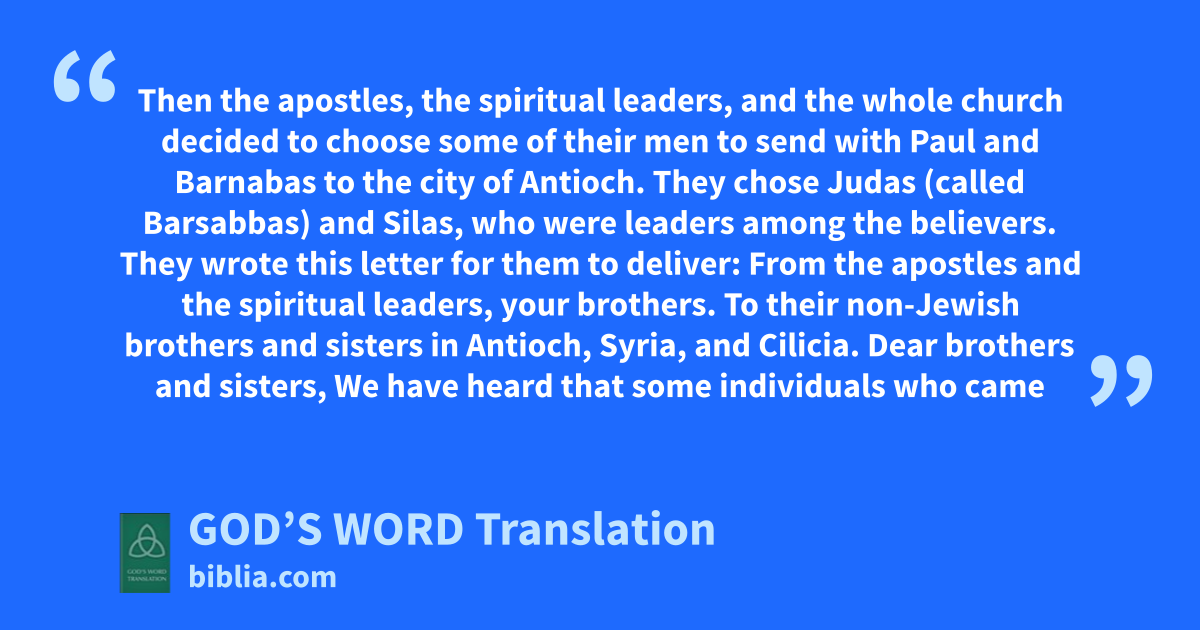22 Then the apostles, the spiritual leaders, and the whole church decided to choose some of their men to send with Paul and Barnabas to the city of Antioch. They chose Judas (called Barsabbas) and Silas, who were leaders among the believers. 23 They wrote this letter for them to deliver: