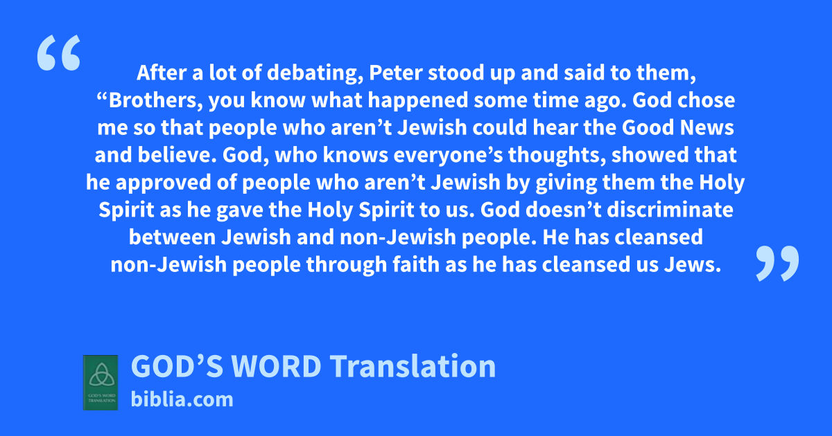 6 The apostles and spiritual leaders met to consider this statement. 7 After a lot of debating, Peter stood up and said to them, “Brothers, you know what happened some time ago. God chose me so that people who aren’t Jewish could hear the Good News and believe. 8 God, who knows everyone’s thoughts, showed that he approved of people who aren’t Jewish by giving them the Holy Spirit as he gave the Holy Spirit to us. 9 God doesn’t discriminate between Jewish and non-Jewish people. He has cleansed non-Jewish people through faith as he has cleansed us Jews. 10 So why are you testing God? You’re putting a burden on the disciples, a burden neither our ancestors nor we can carry. 11 We certainly believe that the Lord Jesus saves us the same way that he saves them—through his kindness.”b