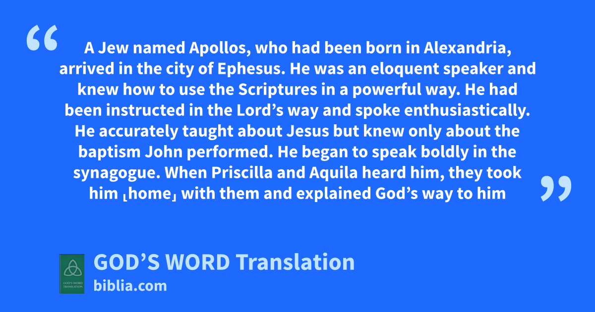 24 A Jew named Apollos, who had been born in Alexandria, arrived in the city of Ephesus. He was an eloquent speaker and knew how to use the Scriptures in a powerful way. 25 He had been instructed in the Lord’s way and spoke enthusiastically. He accurately taught about Jesus but knew only about the baptism John performed. 26 He began to speak boldly in the synagogue. When Priscilla and Aquila heard him, they took him ⸤home⸥ with them and explained God’s way to him more accurately.