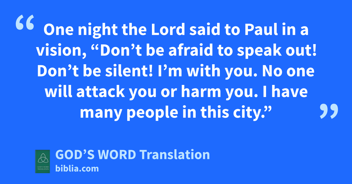 9 One night the Lord said to Paul in a vision, “Don’t be afraid to speak out! Don’t be silent! 10 I’m with you. No one will attack you or harm you. I have many people in this city.”